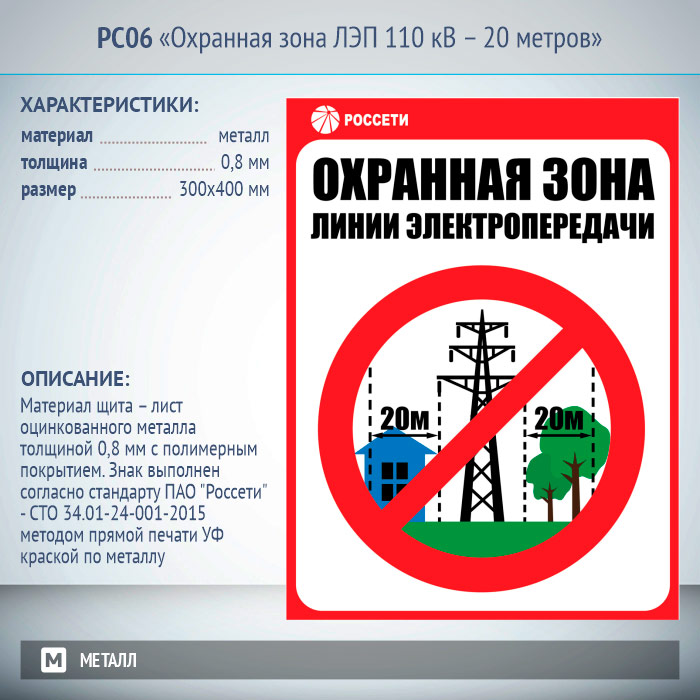 Знак «Охранная зона ЛЭП 110 кВ – 20 метров», РС06 (металл, 300х400 мм) в Красноярске купить