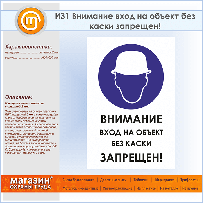 Знак «Внимание вход на объект без каски запрещен!», И31 (пластик, 400х600 мм) в Красноярске купить