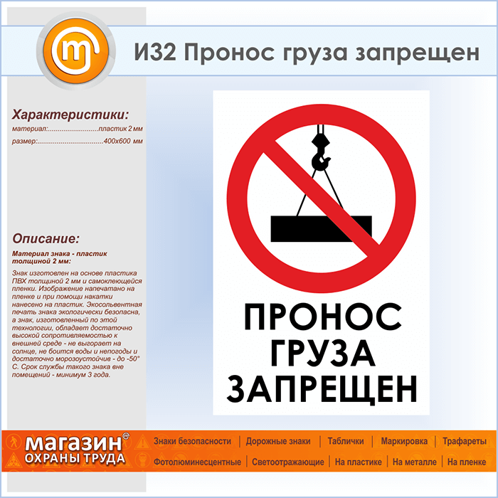 Знак «Пронос груза запрещен», И32 (пластик, 400х600 мм) в Красноярске купить