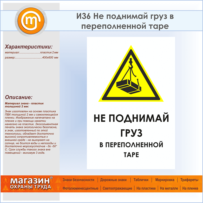 Знак «Не поднимай груз в переполненной таре», И36 (пластик, 400х600 мм) в Красноярске купить