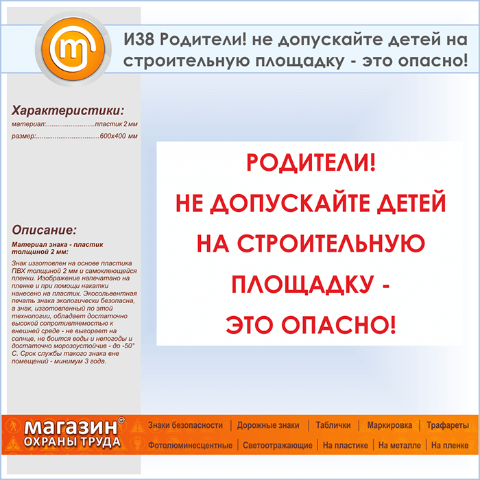 Знак «Родители! не допускайте детей на строительную площадку - это опасно!», И38 (пластик, 600х400 мм) в Красноярске купить