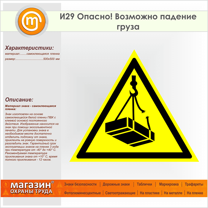Знак «Опасно! Возможно падение груза», И29 (пленка, сторона 500 мм) в Красноярске купить