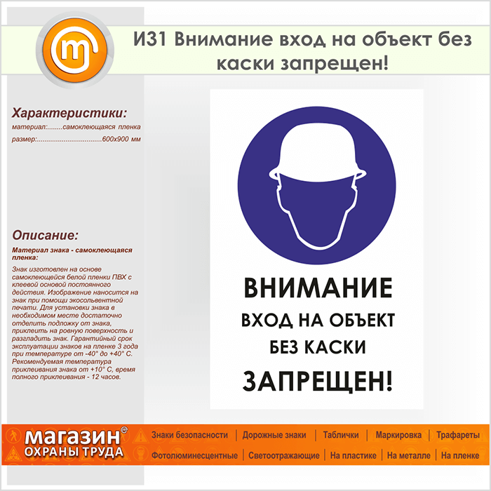 Знак «Внимание вход на объект без каски запрещен!», И31 (пленка, 600х900 мм) в Красноярске купить