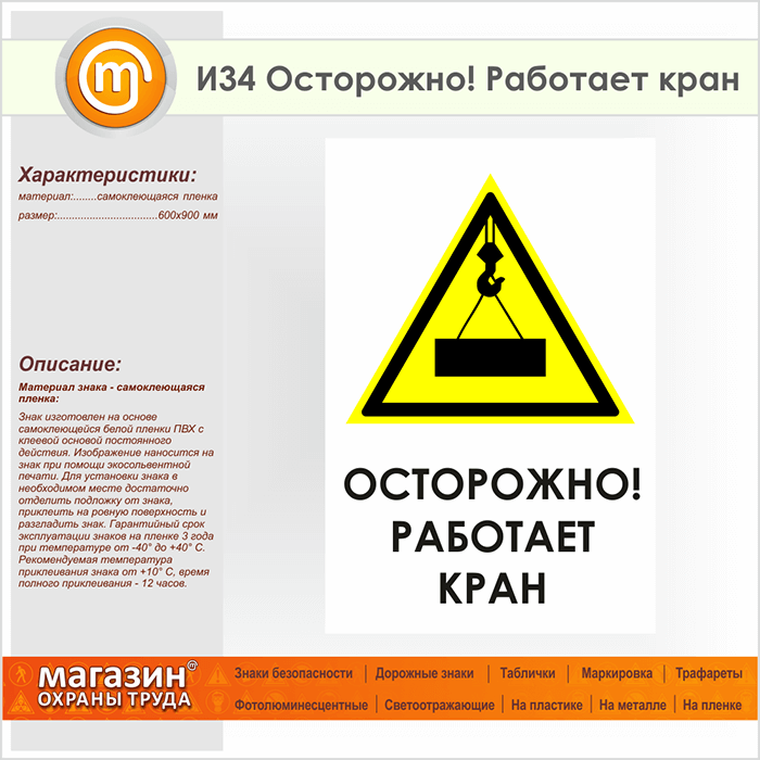 Знак «Осторожно! Работает кран», И34 (пленка, 600х900 мм) в Красноярске купить