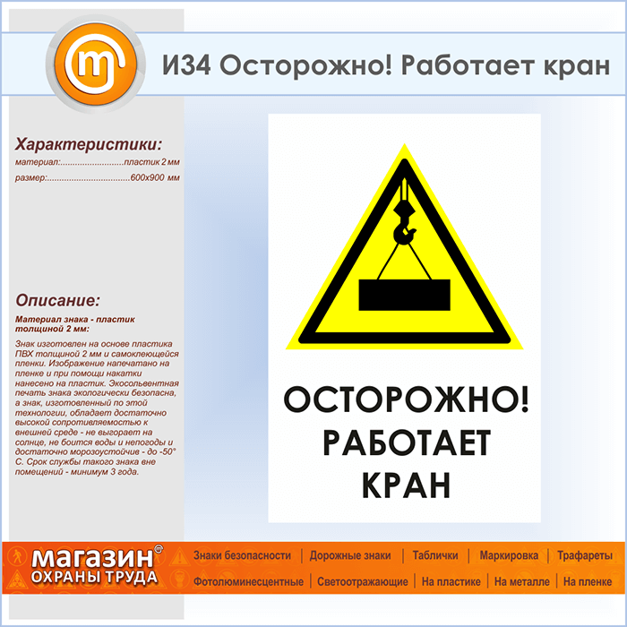 Знак «Осторожно! Работает кран», И34 (пластик, 600х900 мм) в Красноярске купить