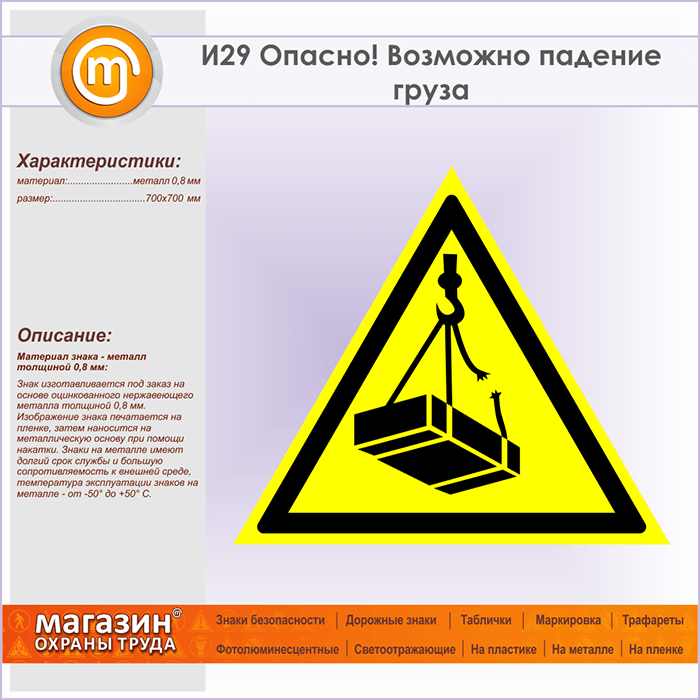 Знак «Опасно! Возможно падение груза», И29 (металл, сторона 700 мм) в Красноярске купить