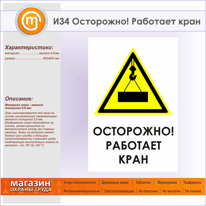 Знак «Осторожно! Работает кран», И34 (металл, 400х600 мм) в Красноярске купить