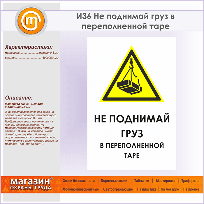 Знак «Не поднимай груз в переполненной таре», И36 (металл, 600х900 мм) в Красноярске купить