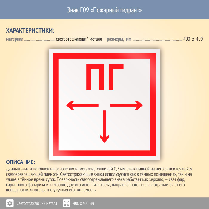 Знак F09 «Пожарный гидрант» (светоотражающий металл, 400х400 мм) в Красноярске купить