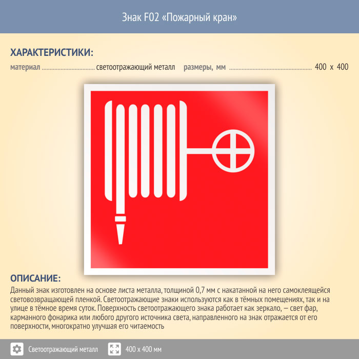 Знак F02 «Пожарный кран» (светоотражающий металл, 400х400 мм) в Красноярске купить
