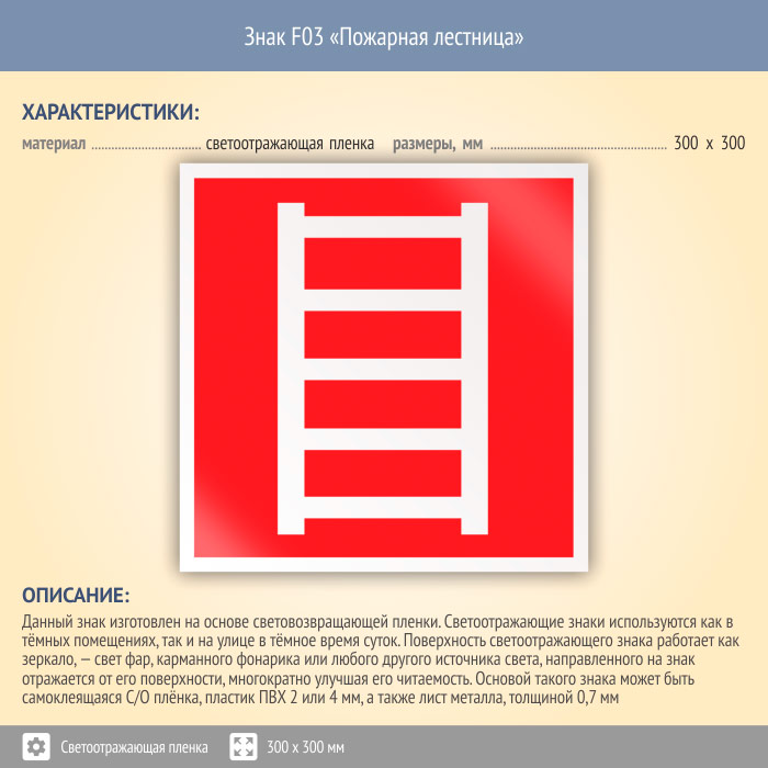 Знак F03 «Пожарная лестница» (светоотражающая пленка, 300х300 мм) в Красноярске купить