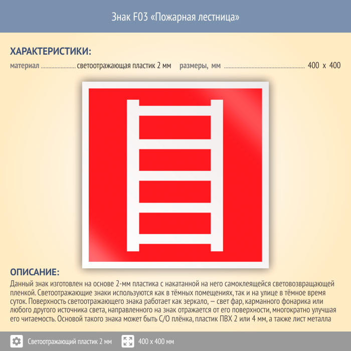 Знак F03 «Пожарная лестница» (светоотражающий пластик, 400х400 мм) в Красноярске купить