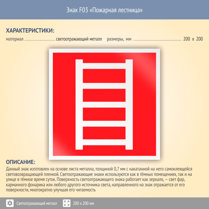 Знак F03 «Пожарная лестница» (светоотражающий металл, 200х200 мм) в Красноярске купить