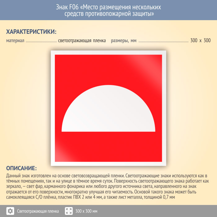Знак F06 «Место размещения нескольких средств противопожарной защиты» (светоотражающая пленка, 300х300 мм) в Красноярске купить