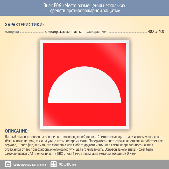 Знак F06 «Место размещения нескольких средств противопожарной защиты» (светоотражающая пленка, 400х400 мм) в Красноярске купить
