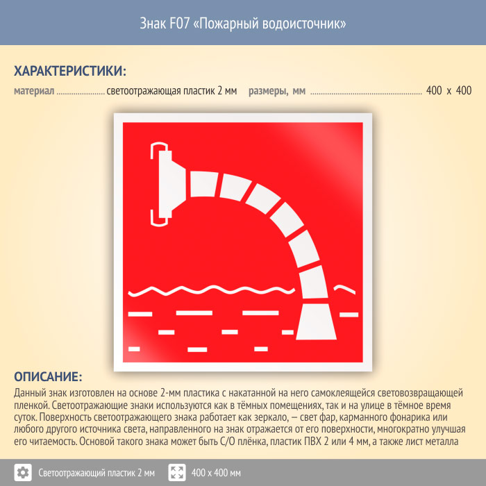 Знак F07 «Пожарный водоисточник» (светоотражающий пластик, 400х400 мм) в Красноярске купить