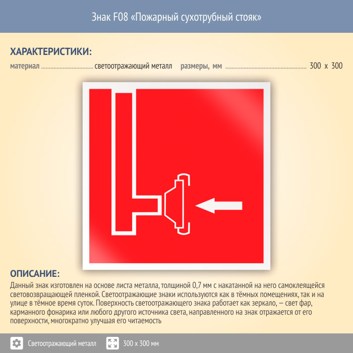 Знак F08 «Пожарный сухотрубный стояк» (светоотражающий металл, 300х300 мм) в Красноярске купить