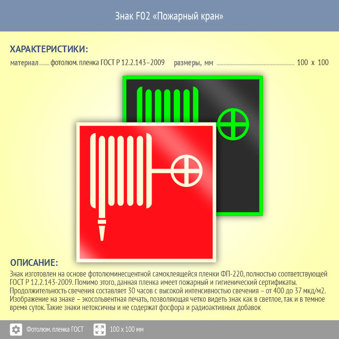 Знак F02 «Пожарный кран» (фотолюминесцентная пленка ГОСТ 34428-2018, 100х100 мм) в Красноярске купить