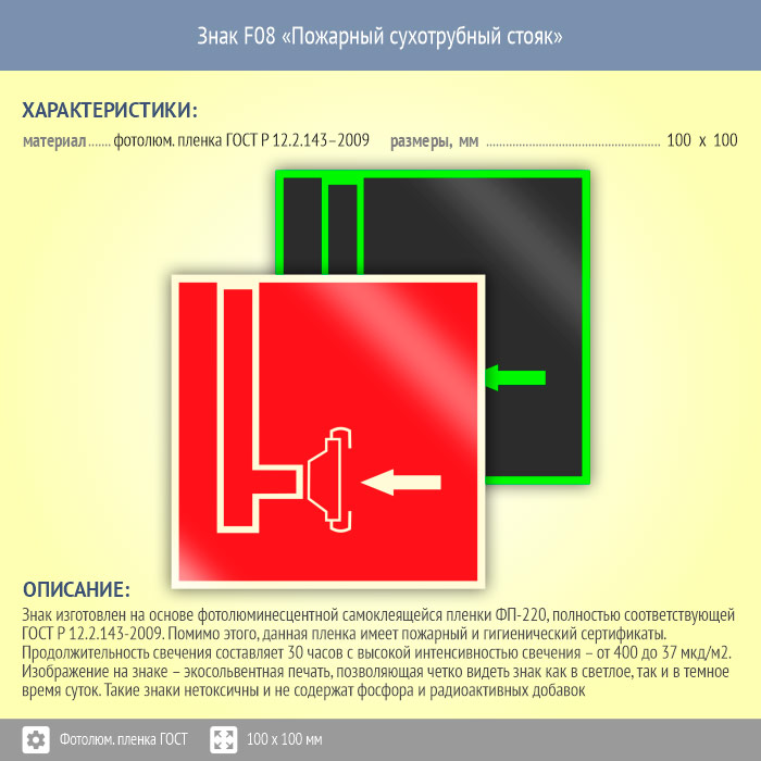 Знак F08 «Пожарный сухотрубный стояк» (фотолюминесцентная пленка ГОСТ 34428-2018, 100х100 мм) в Красноярске купить