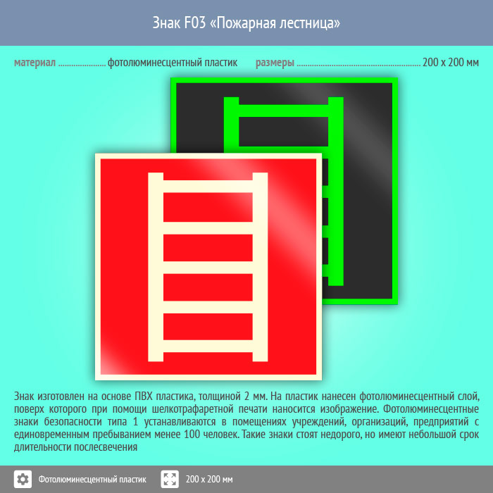 Знак F03 «Пожарная лестница» (фотолюминесцентный пластик, 200х200 мм) в Красноярске купить