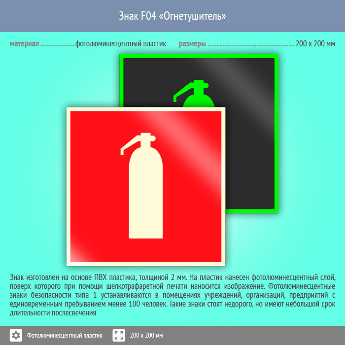 Знак F04 «Огнетушитель» (фотолюминесцентный пластик, 200х200 мм) в Красноярске купить