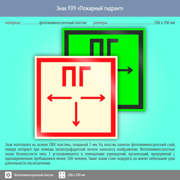 Знак F09 «Пожарный гидрант» (фотолюминесцентный пластик, 200х200 мм) в Красноярске купить