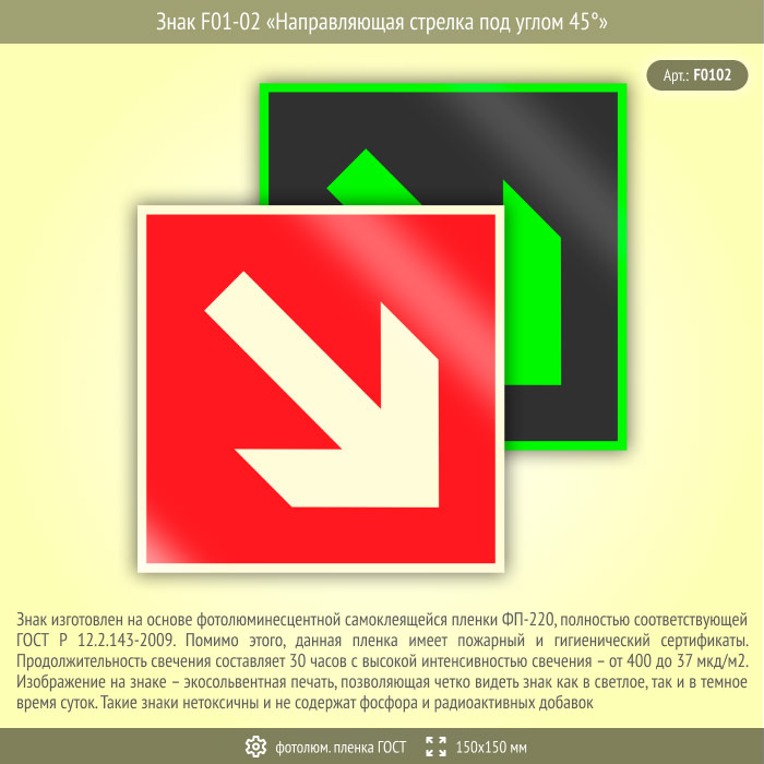 Знак F01-02 «Направляющая стрелка под углом 45°» (фотолюминесцентная пленка ГОСТ 34428-2018, 150х150 мм) в Красноярске купить