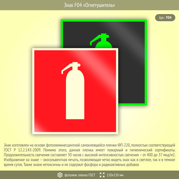 Знак F04 «Огнетушитель» (фотолюминесцентная пленка ГОСТ 34428-2018, 150х150 мм) в Красноярске купить