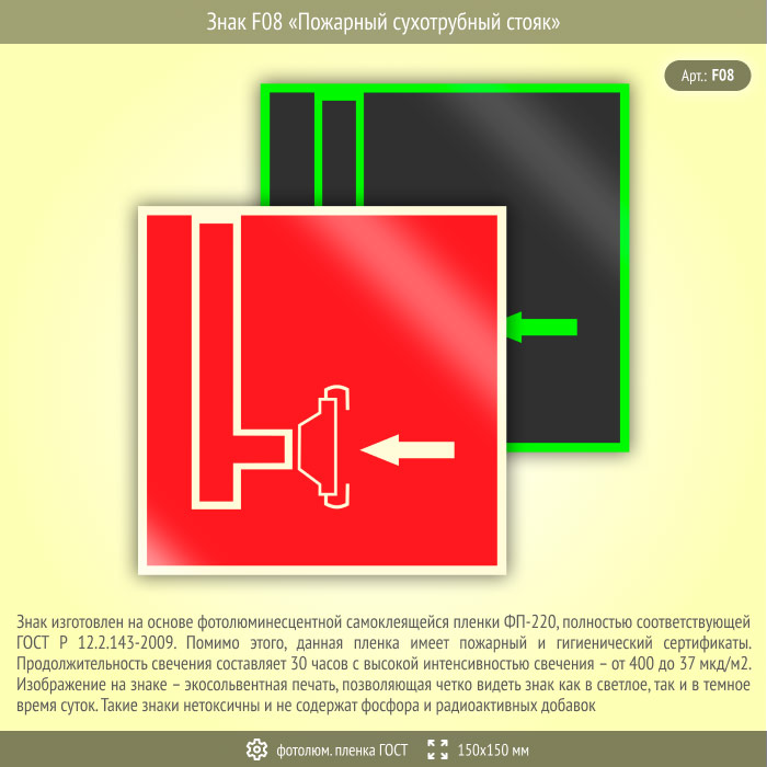 Знак F08 «Пожарный сухотрубный стояк» (фотолюминесцентная пленка ГОСТ 34428-2018, 150х150 мм) в Красноярске купить