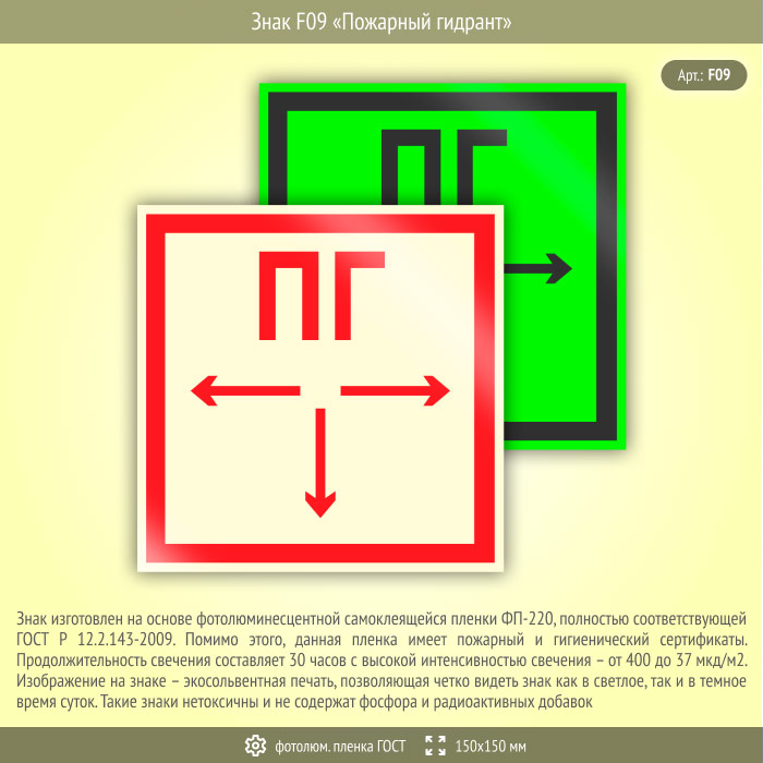 Знак F09 «Пожарный гидрант» (фотолюминесцентная пленка ГОСТ 34428-2018, 150х150 мм) в Красноярске купить