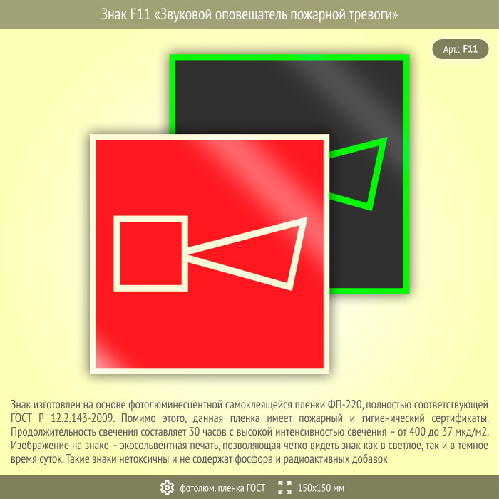 Знак F11 «Звуковой оповещатель пожарной тревоги» (фотолюминесцентная пленка ГОСТ 34428-2018, 150х150 мм) в Красноярске купить
