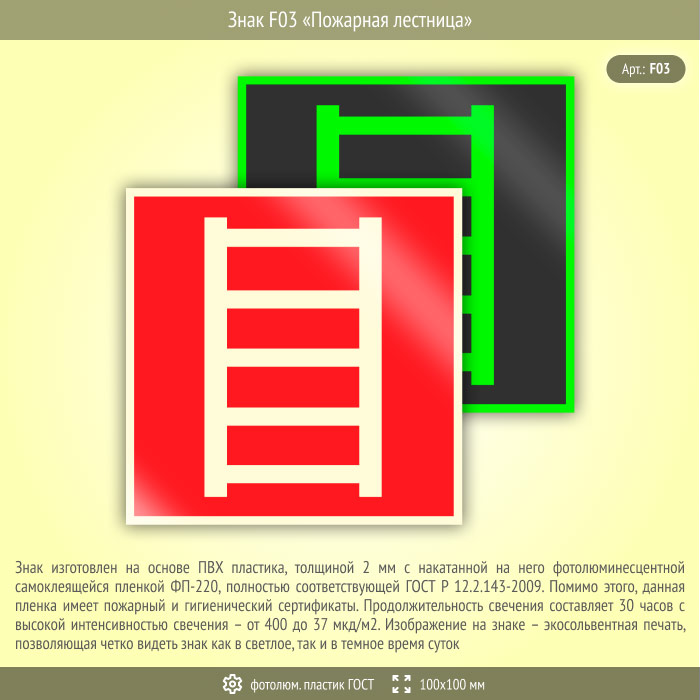 Знак F03 «Пожарная лестница» (фотолюминесцентный пластик ГОСТ 34428-2018, 100х100 мм) в Красноярске купить