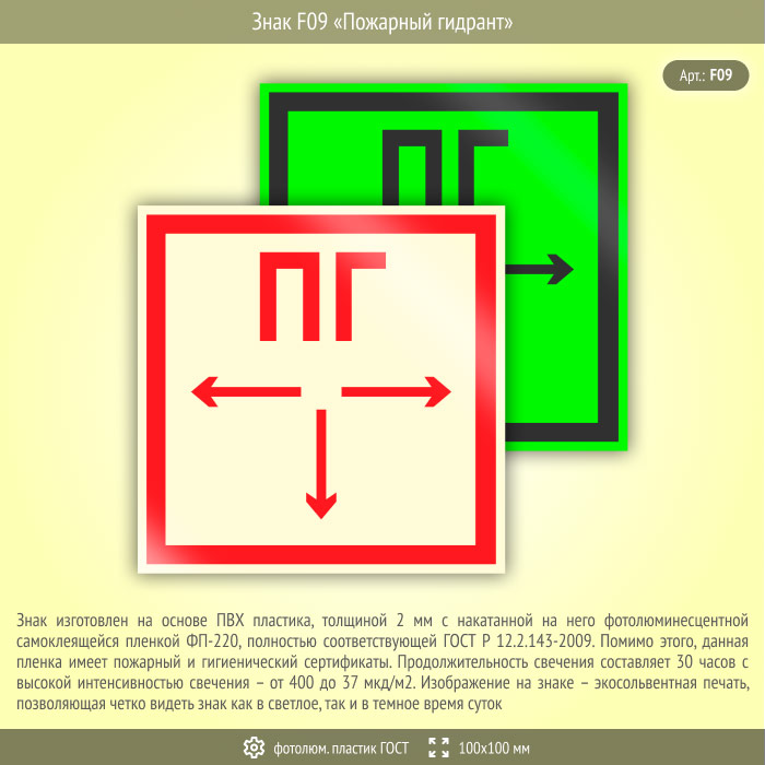 Знак F09 «Пожарный гидрант» (фотолюминесцентный пластик ГОСТ 34428-2018, 100х100 мм) в Красноярске купить