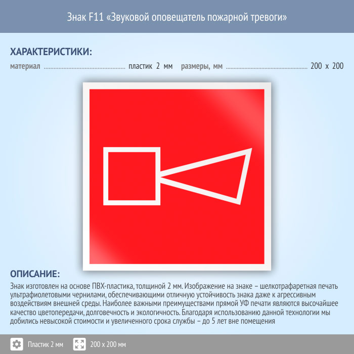 Знак F11 «Звуковой оповещатель пожарной тревоги» (пластик, 200х200 мм) в Красноярске купить