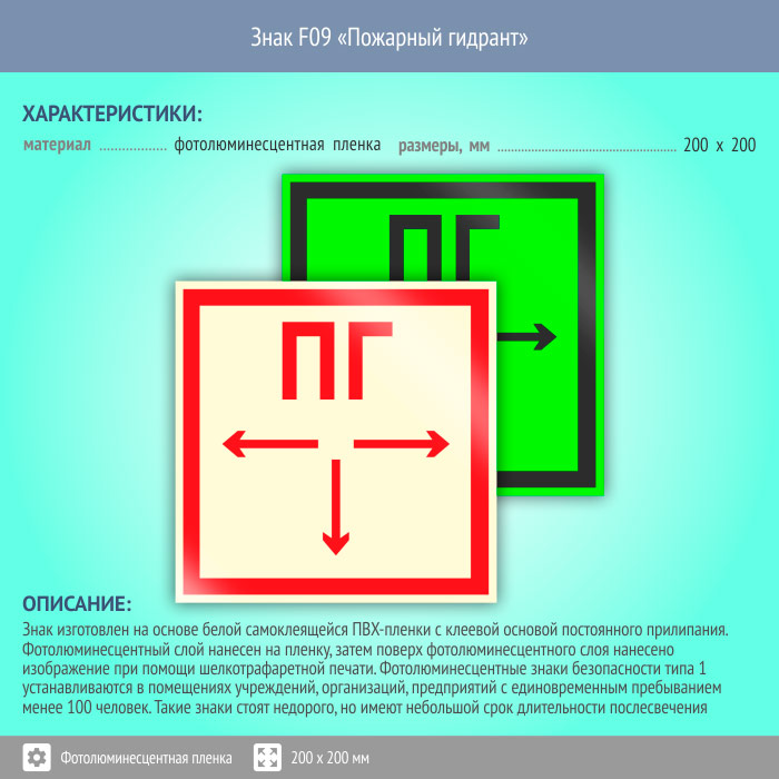 Знак F09 «Пожарный гидрант» (фотолюминесцентная пленка, 200х200 мм) в Красноярске купить