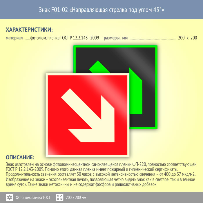 Знак F01-02 «Направляющая стрелка под углом 45°» (фотолюминесцентная пленка ГОСТ 34428-2018, 200х200 мм) в Красноярске купить