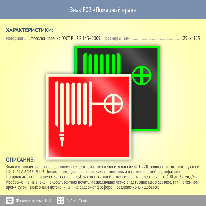 Знак F02 «Пожарный кран» (фотолюминесцентная пленка ГОСТ 34428-2018, 125х125 мм) в Красноярске купить