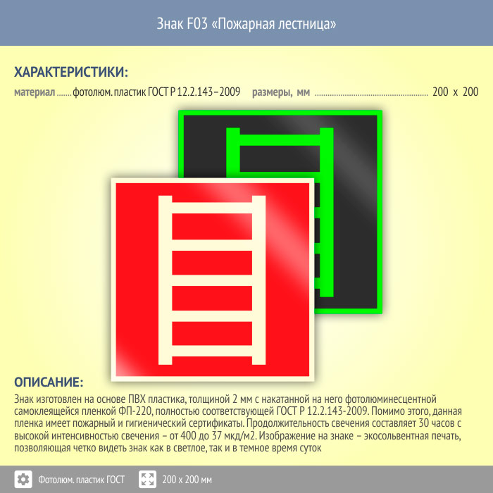 Знак F03 «Пожарная лестница» (фотолюминесцентный пластик ГОСТ 34428-2018, 200х200 мм) в Красноярске купить
