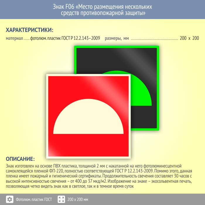 Знак F06 «Место размещения нескольких средств противопожарной защиты» (фотолюминесцентный пластик ГОСТ 34428-2018, 200х200 мм) в Красноярске купить