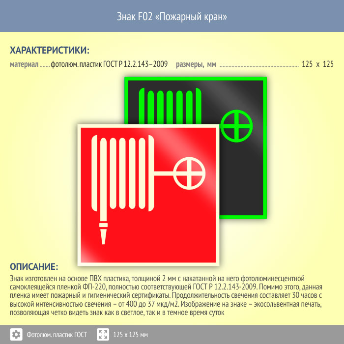 Знак F02 «Пожарный кран» (фотолюминесцентный пластик ГОСТ 34428-2018, 125х125 мм) в Красноярске купить