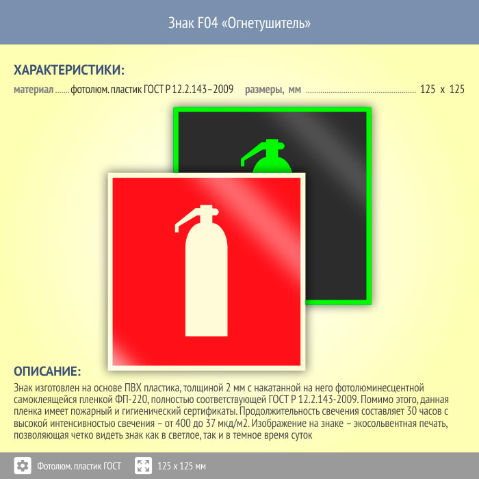 Знак F04 «Огнетушитель» (фотолюминесцентный пластик ГОСТ 34428-2018, 125х125 мм) в Красноярске купить